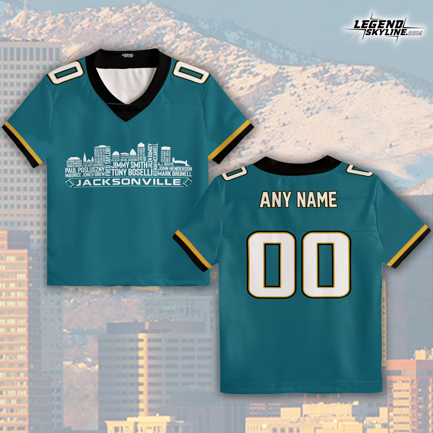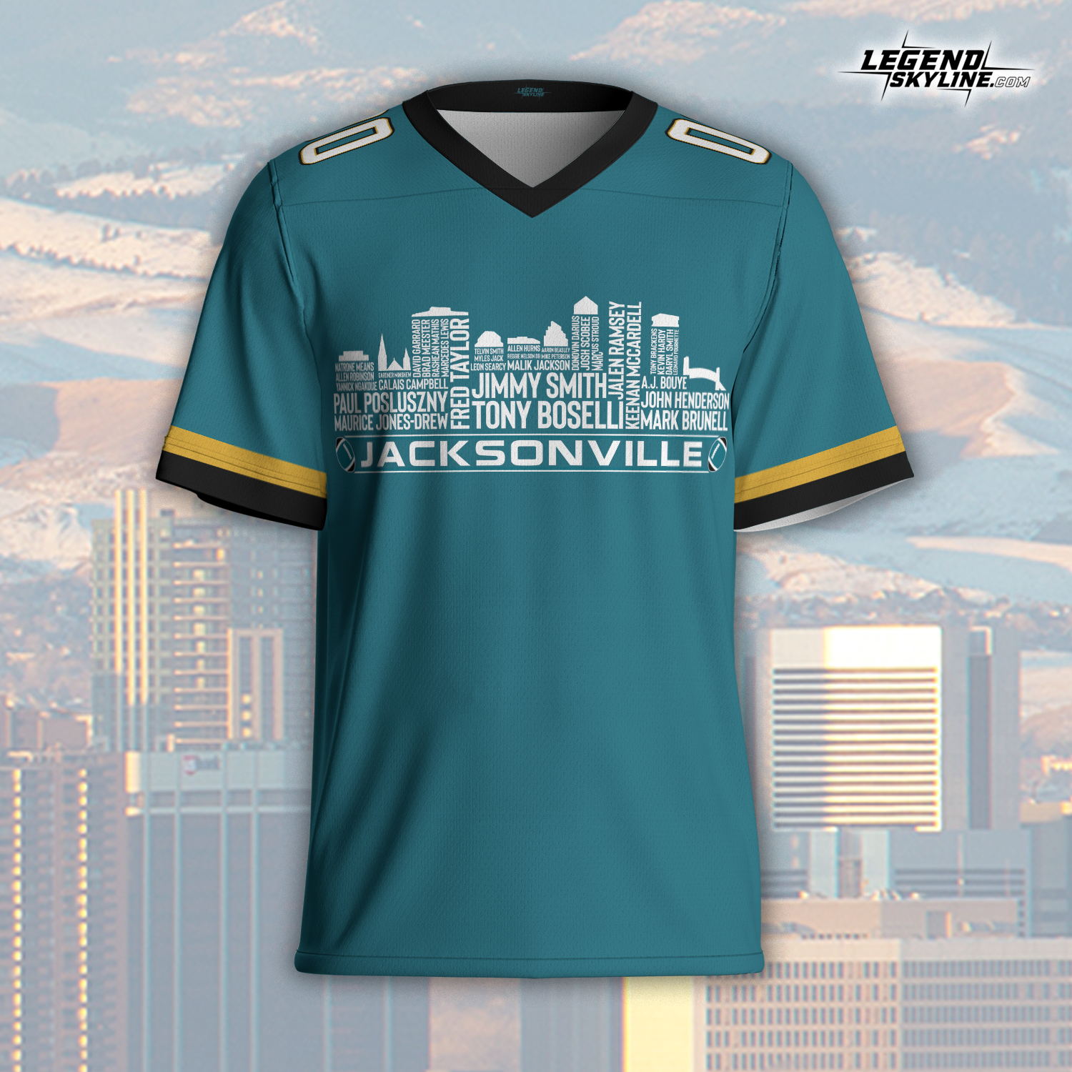Jacksonville Jersey Custom Football Greatest Of All Time Team Legends Jacksonville City Skyline Jersey Shirt, Personalized Embroidery Name Number